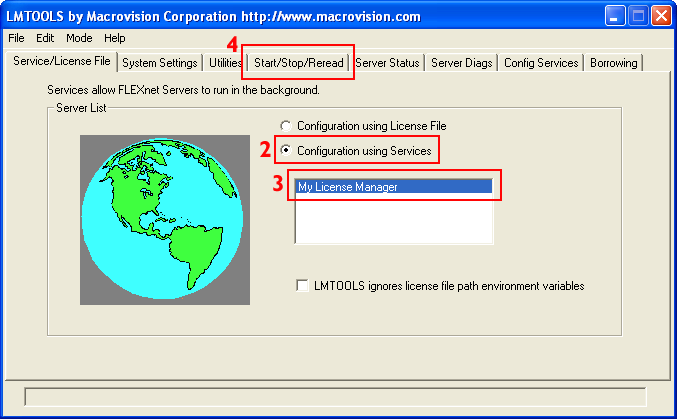 1. Run LMTOOLS if it is not already running. LMTOOLS appears with Service/license file tab open.