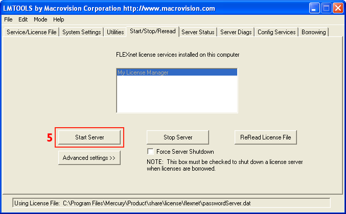 Note: Any time you make a change to the server licenses, you should use the Start/Stop/Reread tab, and press the ReReadLicenseFile button. If the operation fails the first time you press it, wait a few seconds and retry.